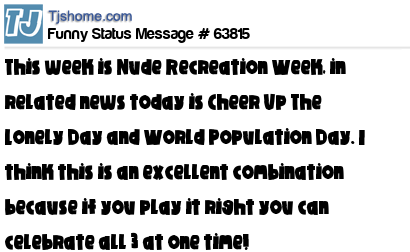 X This week is Nude Recreation Week, in related news today is Cheer Up The Lonely Day and World Population Day. I think this is an excellent combination because if you play it right you can celebrate all 3 at one time!