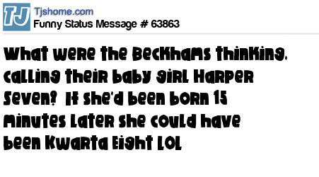X is What were the Beckhams thinking, calling their baby girl Harper Seven? If she'd been born 15 minutes later she could have been Kwarta Eight LOL