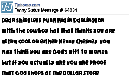 X is Dear shirtless punk kid in Darlington with the cowboy hat that thinks you are ultra cool or either Kenny Chesney, you may think you are God's gift to women but if you actually are you are proof that God shops at the Dollar Store