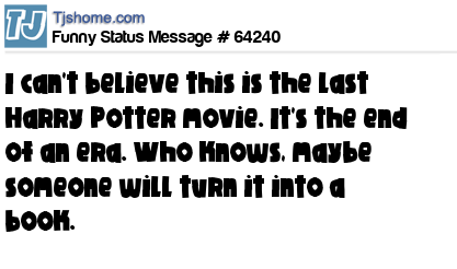X I can't believe this is the last Harry Potter movie. It's the end of an era. Who knows, maybe someone will turn it into a book.