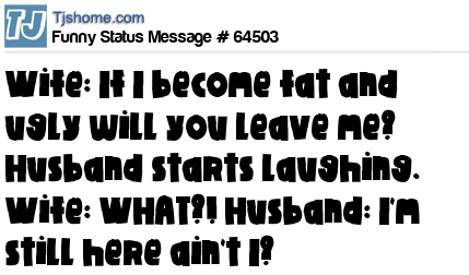 X Wife: If I become fat and ugly will you leave me? Husband starts laughing. Wife: WHAT?! Husband: I'm still here ain't I?