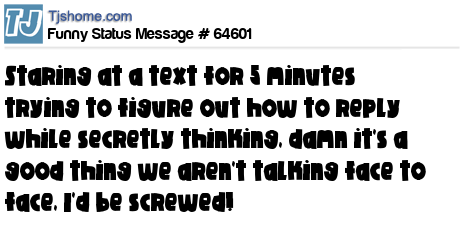 X Staring at a text for 5 minutes trying to figure out how to reply while secretly thinking, damn it's a good thing we aren't talking face to face, I'd be screwed!
