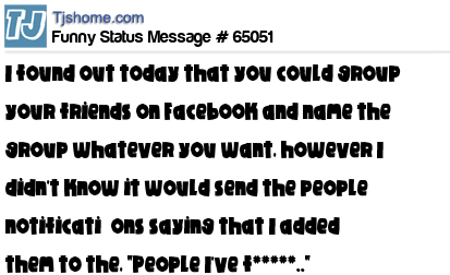 - # 64653 I found out today that you could group your friends on Facebook and name the group whatever you want, however I didn't know it would send the people notifications saying that I added them to the, "People I've screwed" group. Really sorry guys.