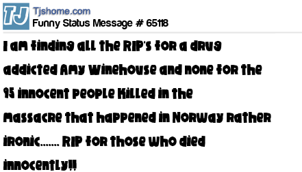 - # 65090 finds all the RIP's for a drug addicted Amy Winehouse and none for the 92 innocent people killed in Norway yesterday rather ironic.....