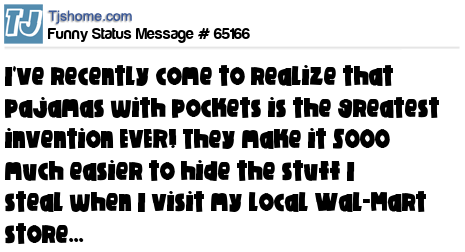 X says I've recently come to realize that pajamas with pockets is the greatest invention EVER! They make it SOOO much easier to hide the stuff I steal when I visit my local Wal-Mart store...