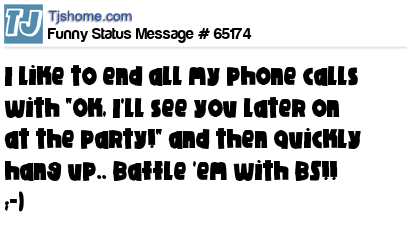 - # 68399 likes to end all my phone calls with "Ok, I'll see you later on at the party!" and then quickly hang up. Let them figure it out.
