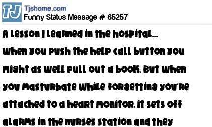 X  A lesson I learned in the hospital... when you push the help call button you might as well pull out a book. But when you masturbate while forgetting you're attached to a heart monitor, it sets off alarms in the nurses station and they show up within secon