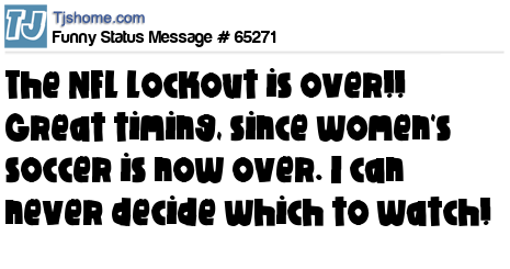 X is The NFL lockout is over!! Great timing, since women's soccer is now over. I can never decide which to watch!