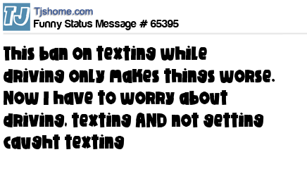 - # 32666 This ban on texting while driving only makes things worse. Now I have to worry about driving, texting AND not getting caught texting.