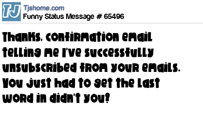 - # 47750 Thanks, confirmation email telling me I've successfully unsubscribed from your emails. You just had to win didn't you?