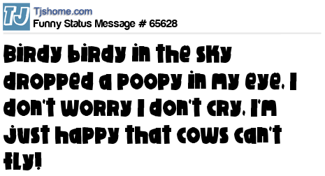 - # 31592 Birdie Birdie in the sky did a poopie in my eye. I dont swear I dont cry I'm just glad that cows dont fly