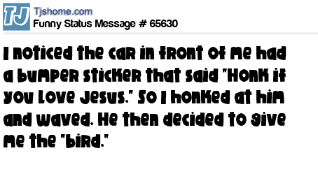 - # 66434 I noticed the car in front of me had a bumper sticker that said "Honk if you love Jesus." So I honked at him and he waved...next time wave with all ALL your fingers!!