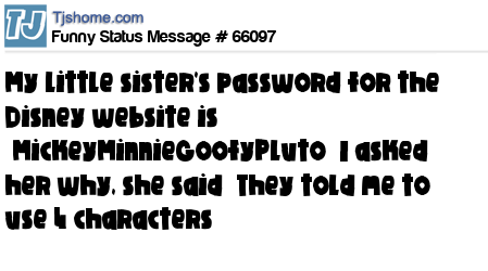X says My little sister's password for the Disney website is “MickeyMinnieGoofyPluto” I asked her why, she said “They told me to use 4 characters”