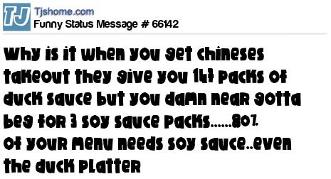X says Why is it when you get chineses takeout they give you 147 packs of duck sauce but you damn near gotta beg for 3 soy sauce packs......80% of your menu needs soy sauce..even the duck platter