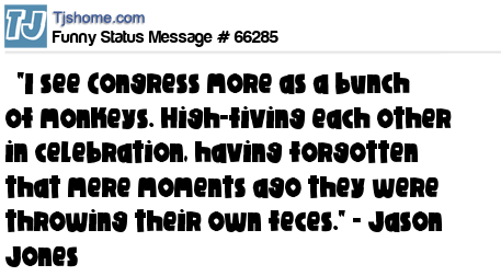 X "I see Congress more as a bunch of monkeys. High-fiving each other in celebration, having forgotten that mere moments ago they were throwing their own feces." - Jason Jones