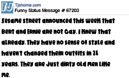 X Sesame street announced this week that Bert and Ernie are not Gay. I knew that already, They have no sense of style and haven't changed their outfits in 25 years. They are just dirty old men like me.
