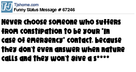 X says Never choose someone who suffers from constipation to be your "In case of emergency" contact, because they don't even answer when nature calls and they won't give a s****