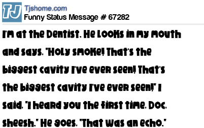 X I'm at the Dentist. He looks in my mouth and says, "Holy smoke! That's the biggest cavity I've ever seen! That's the biggest cavity I've ever seen!" I said, "I heard you the first time, Doc, sheesh." He goes, "That was an echo."
