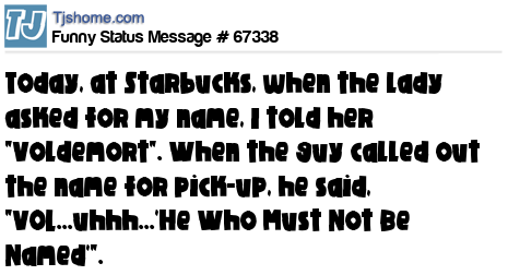 X says Today, at Starbucks, when the lady asked for my name, I told her "Voldemort". When the guy called out the name for pick-up, he said, "VOL...uhhh...'He Who Must Not Be Named'".