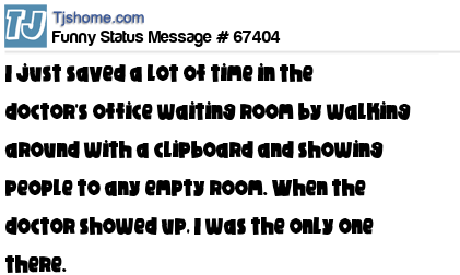 X I just saved a lot of time in the doctor's office waiting room by walking around with a clipboard and showing people to any empty room. When the doctor showed up, I was the only one there.