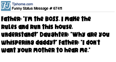 X Father: "I'm the BOSS. I make the rules and run this house, understand?" Daughter: "Why are you whispering daddy?" Father: "I don't want your mother to hear me."