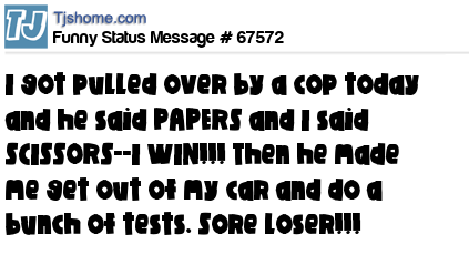 X I got pulled over by a cop today and he said PAPERS and I said SCISSORS--I WIN!!! Then he made me get out of my car and do a bunch of tests. Sore loser!!!