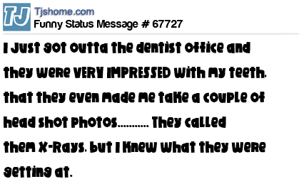 X I Just got outta the dentist office and they were VERY IMPRESSED with my teeth, that they even made me take a couple of head shot photos........... They called them X-Rays, but I knew what they were getting at.