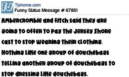 X is Ambercrombie and fitch said they are going to offer to pay the Jersey Shore cast to stop wearing their clothing. Nothing like one group of douchebags telling another group of douchebags to stop dressing like douchebags.
