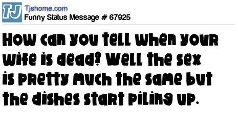 X How can you tell when your wife is dead? Well the sex is pretty much the same but the dishes start piling up.