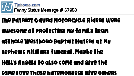 X The Patriot Gaurd Motorcycle Riders were awesome at protecting my family from a$$hole Westboro Baptist Haters at my nephews military funeral. Maybe the Hell's Angels to also come and give the same love those hatemongers give others at the next funeral.