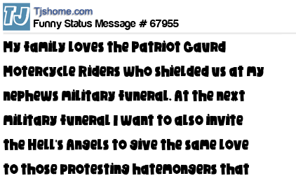 - # 67953 The Patriot Gaurd Motorcycle Riders were awesome at protecting my family from a$$hole Westboro Baptist Haters at my nephews military funeral. Maybe the Hell's Angels to also come and give the same love those hatemongers give others at the next funeral.