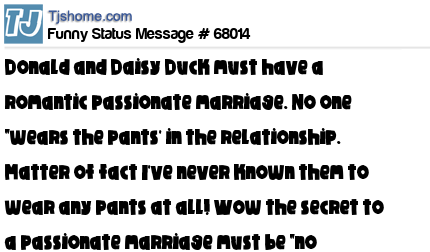 X Donald and Daisy Duck must have a romantic passionate marriage. No one "wears the pants' in the relationship. Matter of fact I've never known them to wear any pants at all! Wow the secret to a passionate marriage must be "no pants."