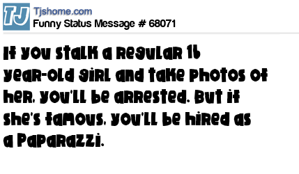 - # 67919 If you stalk a regular 16 year-old girl and take photos of her, you'll be arrested. But if she's famous, you'll be hired.