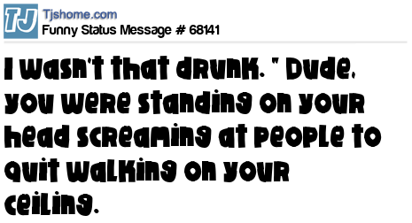 X says I wasn't that drunk. " Dude, you were standing on your head screaming at people to quit walking on your ceiling.