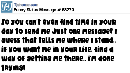 X So you can't even find time in your day to send me just one message? I guess that tells me where I stand.. if you want me in your life, find a way of getting me there.. i'm done trying!