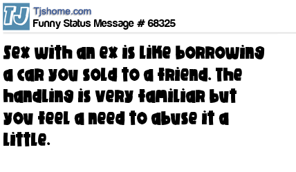 X Sex with an ex is like borrowing a car you sold to a friend. The handling is very familiar but you feel a need to abuse it a little.