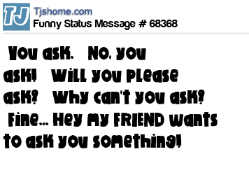 X “You ask.” “No, you ask!” “Will you please ask?” “Why can't you ask?” “Fine… Hey my FRIEND wants to ask you something!”