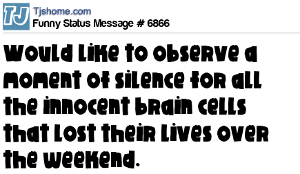 - # 9736 Hasnt Slept since thursday night.....Id like to request a moment of silence for all the innocent Brain cells lost over the events of the last 48hrs, you will be greatly missed. kk time 4 sleep