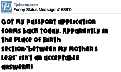 - # 105348 Got my passport application forms back today..... Apparently in the Place of Birth section:"between my mother's legs" isn't an acceptable answer.
