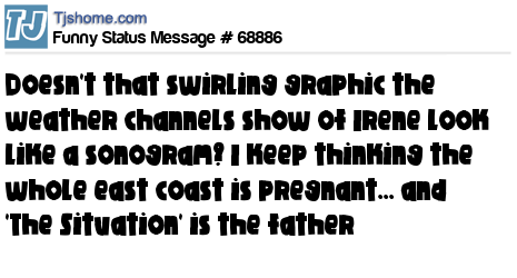 X doesn't that swirling graphic the weather channels show of Irene look like a sonogram? I keep thinking the whole east coast is pregnant... and 'The Situation' is the father