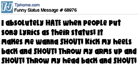 - # 69041 I absolutely HATE when people use song lyrics as their status! It makes me wanna SHOUT! Kick my heels back and SHOUT! Throw my arms up and SHOUT! Throw my head back and SHOUT!