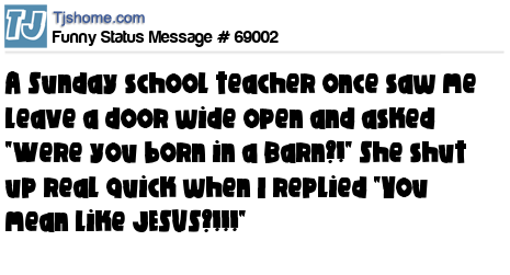 X A Sunday school teacher once saw me leave a door wide open and asked "Were you born in a Barn?!" She shut up real quick when I replied "You mean like JESUS?!!!"