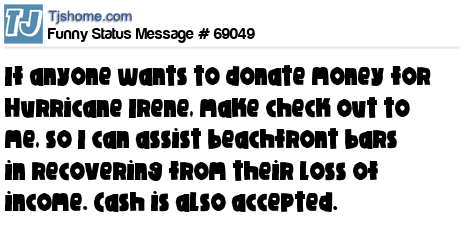 X If anyone wants to donate money for Hurricane Irene, make check out to me, so I can assist beachfront bars in recovering from their loss of income. Cash is also accepted.