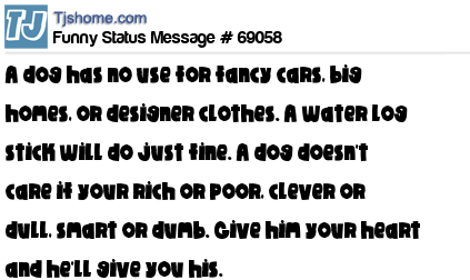 X A dog has no use for fancy cars, big homes, or designer clothes. A water log stick will do just fine. A dog doesn't care if your rich or poor, clever or dull, smart or dumb. Give him your heart and he'll give you his.