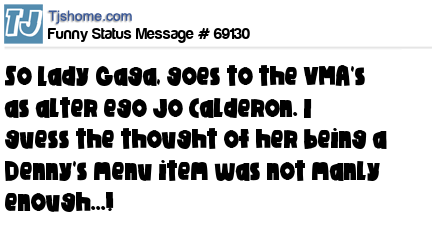 X is So Lady Gaga, goes to the VMA's as alter ego Jo Calderon. I guess the thought of her being a Denny's menu item was not manly enough...!