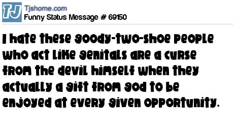 X says I hate these goody-two-shoe people who act like genitals are a curse from the devil himself when they actually a gift from god to be enjoyed at every given opportunity.