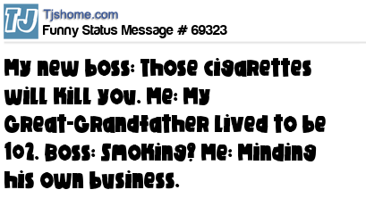 X My new boss: Those cigarettes will kill you. Me: My Great-Grandfather lived to be 102. Boss: Smoking? Me: Minding his own business.