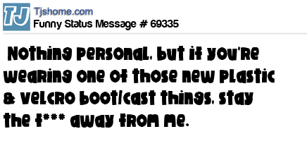X Nothing personal, but if you're wearing one of those new plastic & velcro boot/cast things, stay the f*** away from me.