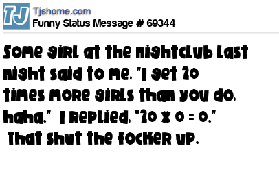 - # 28684 Some idiot in a nightclub came up to me and said, "I get 20 times more girls than you do! Haha!!."I replied, "20 x 0 = 0!" That shut him up.