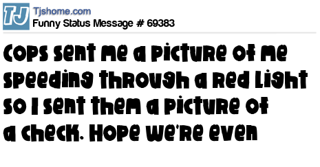 - # 69503 Cops sent me a picture of me speeding through a red light so I sent them a picture of a check.Cop then sends me a picture of handcuffs.You win !!